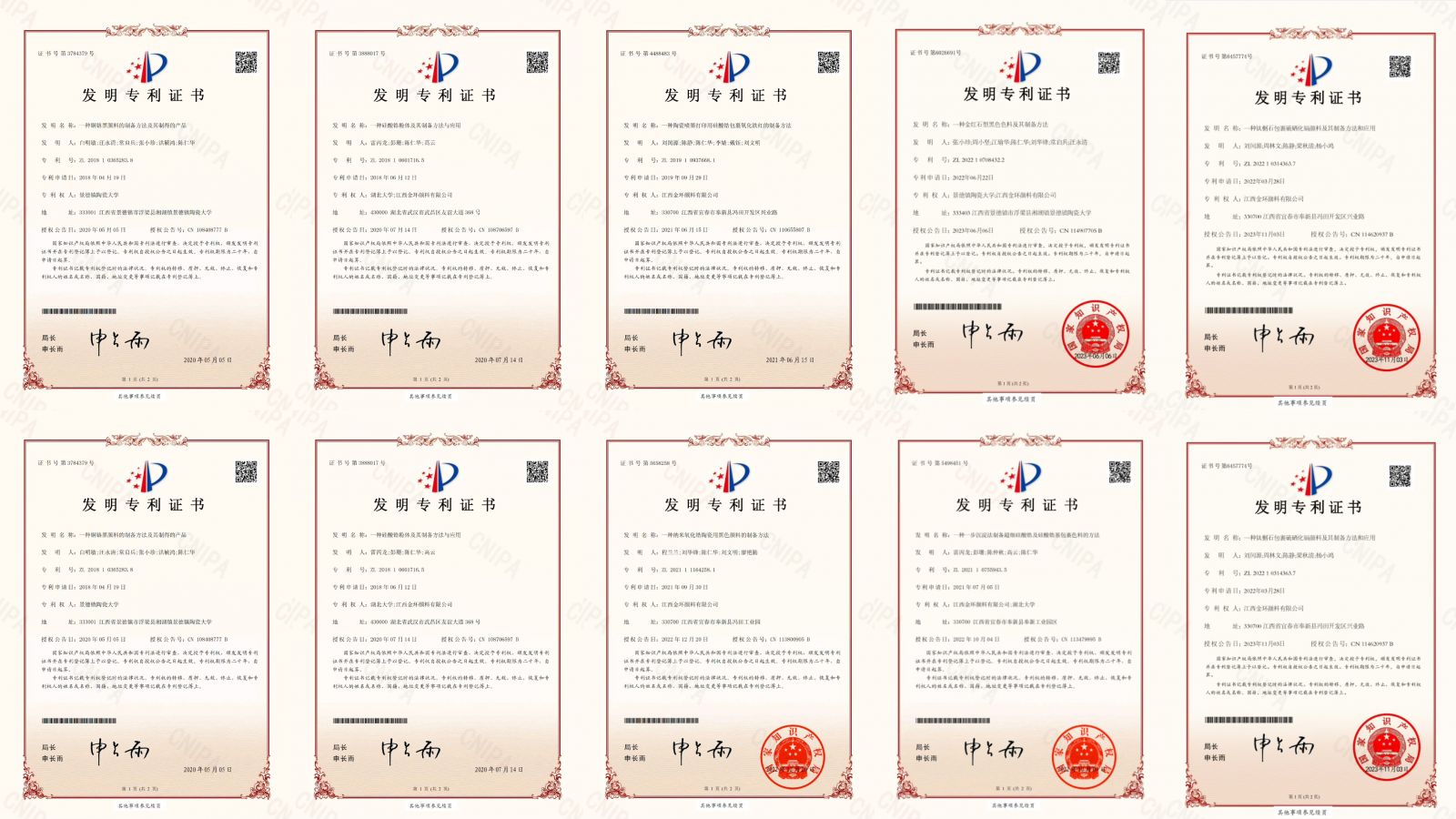 With continuous improvement and innovation in technology, "Jinhuan Pigments" has successively approved the innovation platforms like "National High_tech Enterprise", 'China Enamel inorganic Pigment innovation Research & Development Center", "Jiangxi Environmental Protection inorganic Pigment Engineering Technology Research Center" "Jiangxi Post-Doctoral Innovation Practice Base", "Jiangxi Energy Saving and Emission Reduction Demonstration Base", "Jiangxi Specialized and Sophisticated Minor Enterpriseand "Jinadezhen Ceramic University Practice Base", owned 12 authorized invention patentsand 7 authorized utility model patents.